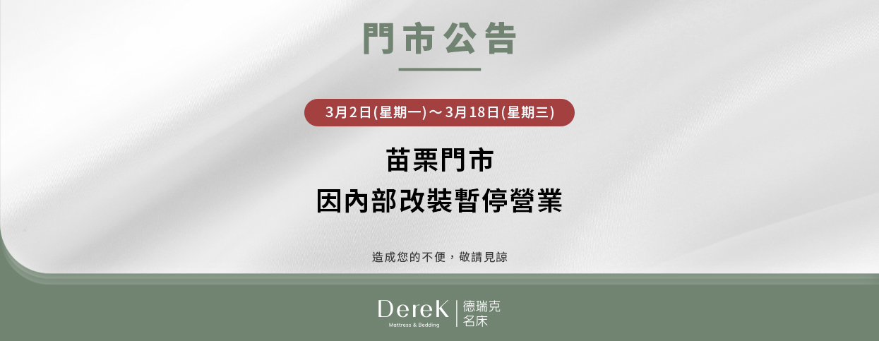 【德瑞克│苗栗床墊體驗館】提供苗栗粉絲無壓試躺床墊的環境,睡眠困擾諮詢服務,各種舒眠商品實物體驗,門市官網價格同步透明, 10天在家試睡,床墊享24期0利率,協助每位粉絲解決睡眠困擾。