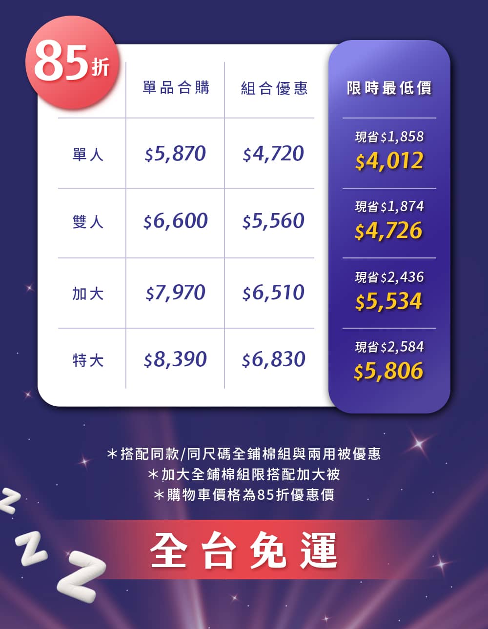 全館85折/指定組合8折 狂購床墊寢具讓你睡翻每夜