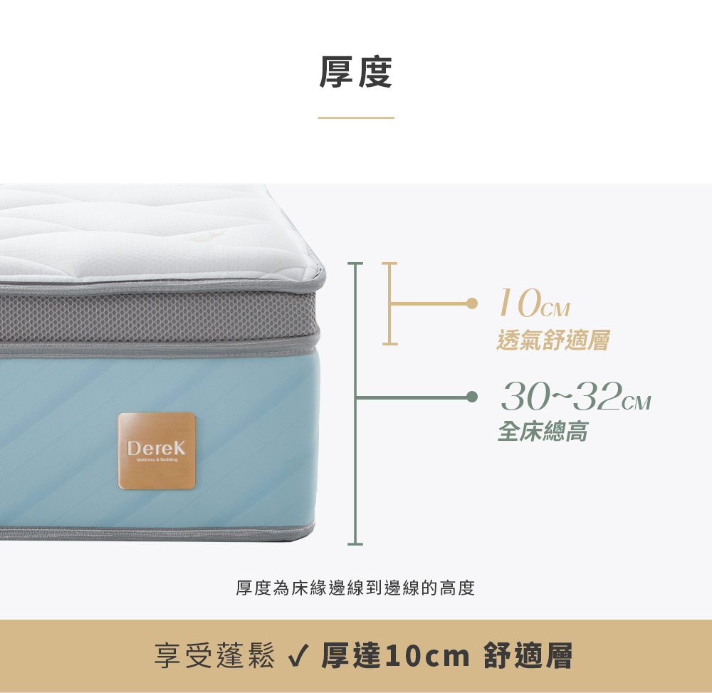 Derek極致雲端床墊-雙人床墊:長188*寬152*厚30~32cm(全床±2cm).重50KG 筒數:44*37=(1628顆) *廣告宣稱1824顆獨立筒顆數為舊資料,採用領料時的獨立筒顆數。因加工時泡棉護框升級為7cm後,四周拿掉獨立筒顆數變多,商品內顆數更改如上*