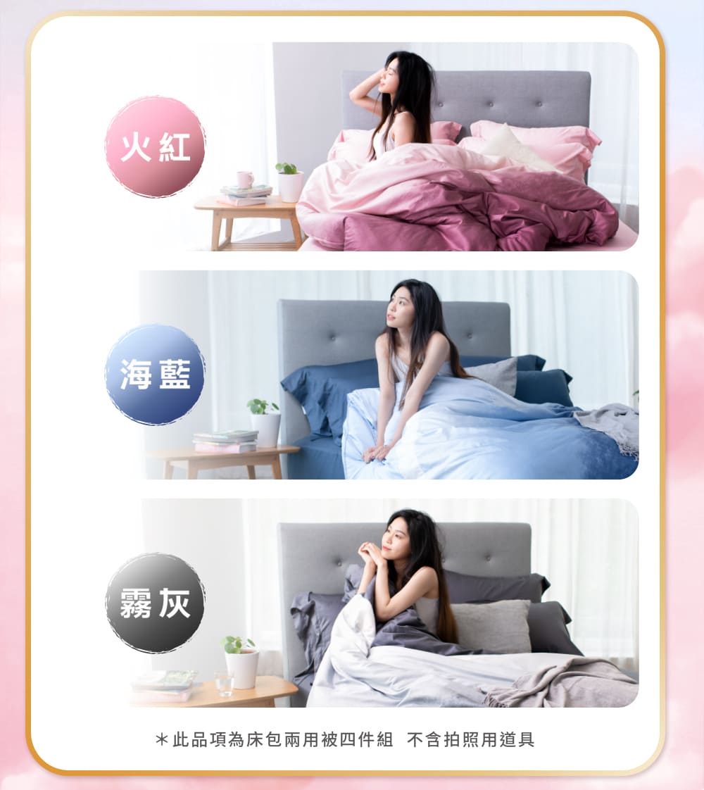 內容物:床包x1、兩用被套x1、枕套x2(單人x1)